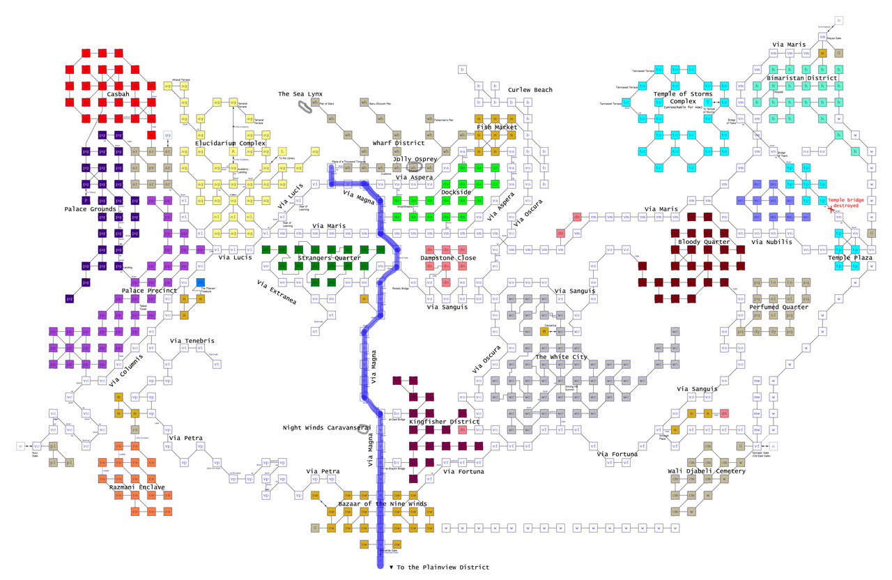 I took the liberty of snagging Mistsparrow's lovely map and adding some basic tags of street names and neighborhoods to it for ease of use, I hope this is okay :) If I've gotten things wrong, please let me know! I've done this mostly from memory so it's very possible not everything is correct. I have highlighted the Via Magna in blue, as that is the main thoroughfare and where you are most likely to find what you need in the city as well as people to RP with usually. And I've added in the location of the Night Winds Caravanserai (a popular meeting place and a place you can rent a private room) as well as the Sea Lynx where it's docked at the Pier of Stars and the Jolly Osprey. There's lots more to see and discover, obviously, but I thought this might at least help those who are perhaps feeling particularly overwhelmed. It is a very big city! But it's also incredibly beautiful and well-written and really rewarding to explore, so I highly recommend taking some time to get lost and enjoy the scenery. :) This is all very quick and dirty, by no means very good, just an attempt to help out a bit. |